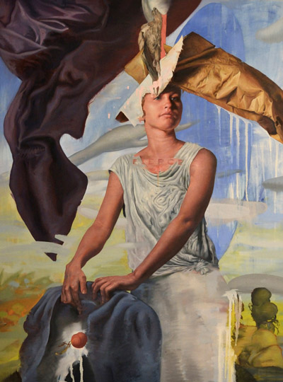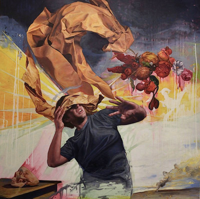 RELEASING THE VEIL Free public artist talk: Saturday, January 25, 4pm. This solo exhibition of eleven of Jason John's recent paintings is one of six selected from among 165 proposals submitted for consideration for Manifest's tenth season. Manifest is proud to showcase these dramatic paintings in our Main Gallery. John's tightly crafted yet playfully surreal works are energized by color, composition, and the theatrical narratives implied by the interaction of the human subjects within environments at once restricting and liberating. Of his work John states: "My interest as an artist is related to how people build personal identity in relation to personal memory and their social world. The situations the individual has experienced can drastically alter the shape of a person’s memory and furthermore, a person’s identity and social perception. As a painter, I represent figures trapped in an environment of uneasiness and flux. Some or all of the people in my paintings are concealed by a veil or mask. Partially concealing the identity of an individual removes the personal relationship viewers would expect to feel for those represented. Each character in my paintings has become one with their environment and can evolve toward empowerment or devolve into personal displacement and loss of identity." Jason John's work is represented at WWA Gallery in Los Angeles, California and Sylvia White Gallery in Ventura, California. Recently Jason was inducted into the Museum of Realist Art in Boston, Massachusetts. His work has been on the covers of Blue Canvas Magazine, Art Calendar, Poets and Artists Magazine, and Visual Arts Overture Magazine. His work has also been featured in American Arts Quarterly, American Art Collector Magazine, Manifest Gallery’s International Painting Annuals 1, 2, and 3, Studio Visit Magazine, Creative Quarterly Magazine, and Aesthetica Magazine. Jason is presently assistant professor of painting at University of North Florida in Jacksonville.