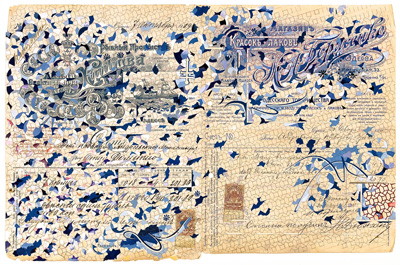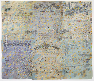 Of his work Navarra states: "I have always defined drawing as making marks on a surface, which leaves the door open for what is a mark and what is a drawing surface. In my case, I have chosen to work on old 'found paper' documents. Being more than 100 years old, I inherit a history of mark-making circumstance on these found documents in regards to stains, tears, smudges, folds, color of paper, design elements, stamps, gesture, and a narrative, just to name a few. It is a vocabulary of preordained aesthetics that I must react to, develop a relationship with, choose to enhance, delete, adopt, or obliterate, while imposing new layers from my own time and interval of space. In a sense, it becomes a metaphor for how we deal with our past and our collective history, whether we choose to ignore it, change it, embellish it, and/or bring its more important components into the light of day."