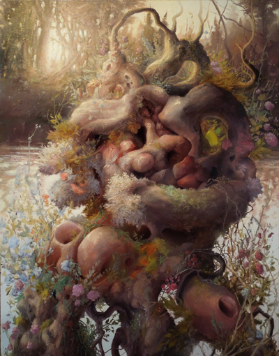 Public artist's talk: Friday, May 15, 6pm This solo exhibition of Adrian Cox's work is one of eleven selected from among 199 proposals submitted for consideration in Manifest's current season. Border Creatures brings an entire ecosystem into Manifest's Main Gallery, populating it with Cox's recent surreal conceptions. Walking a delicate and therefore powerful line between narrative illustration, traditional figurative painting subjects, and expressionism, the mostly large works allude to much that has come before, yet they stand firmly on their own. This makes for what can only be considered a unique and impactful experience in the situation of an in-the-round gallery presentation. Of his work the artist states: My work weaves a narrative of transgressive embodiment and builds a mythos of the grotesque. The characters in these paintings obliterate the natural limits of the body; sensuous extensions and wound-like openings facilitate an intense connection to their environment. I call these figures Border Creatures, as they are defined by such shifting and indeterminate boundaries. Adrian Cox (born 1988) is a painter living and working in St. Louis, Missouri. His studio practice involves a continuing exploration of transgressive bodies in figurative painting. In his recent work, he seeks to create a mythology of the grotesque, representing the morphic body as a heroic and empathetic subject. Adrian currently works as an adjunct lecturer in painting in the Sam Fox School of Design & Visual Arts at Washington University in Saint Louis.