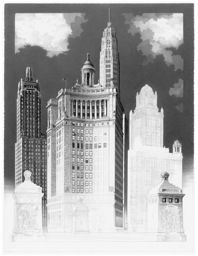 Of her work Merrill states: "My work explores the places that surround us, spaces that often overflow with contradictory architectural styles and cultures – the voices of different eras – all struggling for visual prominence. I make thousands of individual photographs, videos and audio recordings while exploring a city or neighborhood. In the studio, I then digitally assemble and re-assemble these sources to create new photographs and videos of imaginary spaces. Each image is typically made from tens to hundreds of bits and pieces of different photographs or videos. Some of the images have some veracity, but more often they suggest a visual hyperbole – an embellished scene circulating around a small detail or object that fascinated me. The scenes in both the photographs and the videos are spaces that feel familiar but not place-able. They tap into some of the conscious and subconscious visual cues, barriers and borders we create – a language that is shared by urban, suburban and rural spaces. The movements in the videos are the subtle, ambient changes in an environment: leaves fluttering in the wind, the movement of clouds, light and shadows shifting on the street. The faint movement in these videos share as much with photographs as moving images: the vantage point is fixed and the stillness of the scene is amplified by the faint changes in each environment. The imagery in both the videos and photographs play off one another creating a sense of pleasure and curiosity in seeing the familiar become unfamiliar.”