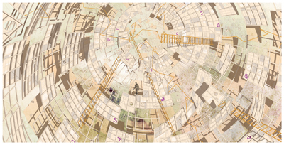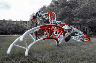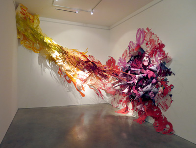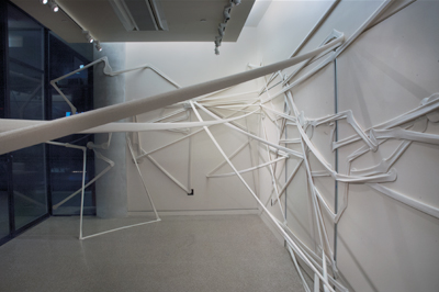 So often works of art are portable, providing a transferable context-independent experience. This is especially the case in a gallery like Manifest which exhibits works from broad national and international origins on a regular basis. However this fact tends to preclude the presentation of works made site-specific, either customized for installation in our galleries, created on-site, or otherwise contingent upon assembly, display, or experience in a particular place. So in an effort to expand our exhibition scope Manifest called for proposals for works that would be made in place. We reviewed 60 proposed works by 23 artists from 12 states. Two works by two artists, each devoted to its own gallery space, were selected for exhibition and will also be documented in the Manifest Exhibition Annual publication (MEA) at the close of the season. main gallery Eric Troffkin This work brings Troffkin's modular structures indoors through a surreal merging of a twisting communication tower-like structure and various semi-geometric pods. Juxtaposed into the context of our comparatively small gallery the work plays off the idea of the organic growth of technology, or perhaps mutation through forced cultivation. drawing room What I see is what you get, 2014 (Cincinnati), 2015 The work in the gallery will be generated using software that tracks the artist's gaze through the gallery space over time. The data will then be transferred into actual material, direction, intersections, and size changes and ultimately the shape of the work in space. The work fittingly brings a different perspective to the notion of drawing, time in art, and the gallery space as a place for art to happen.