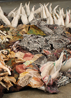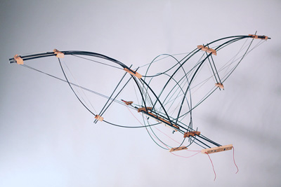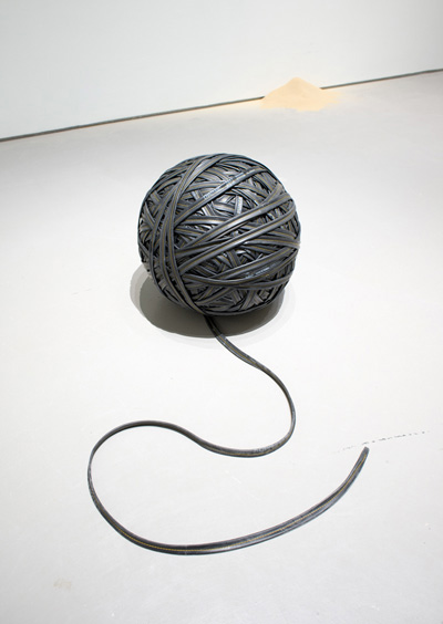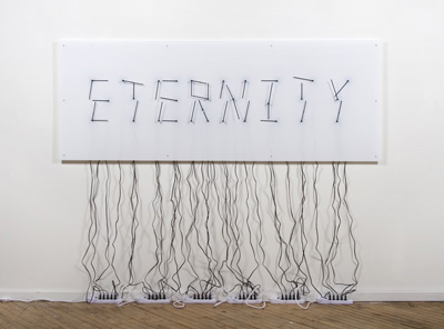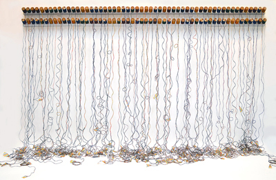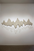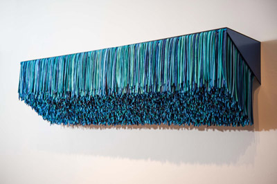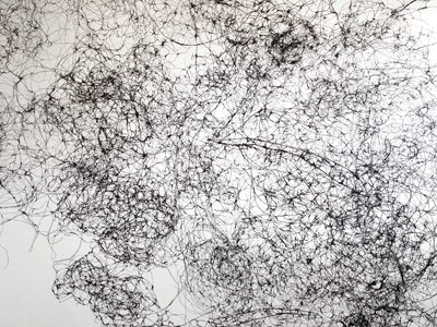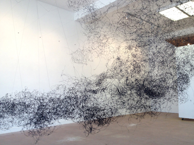Of her work the artist states: "Swarm consists of abstracting thoughts and sensations into a gradually expanding web of lines. Through the act of drawing in three-dimensional space, this project explores the idea of image-space, which has been the foundation of my creative process. The composition of this work is unpredictable and changes from one installation to another, affected by the spatial condition and intuitive choices made while linking hundreds of segments...With a vein-like structure made of contours and intervals, Swarm creates a milieu where there is neither beginning nor end, but always a middle from which it grows and which it overspills. ”