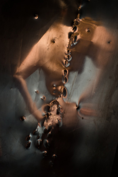 Manifest is pleased to present Lucas James’s EVENT HORIZONS, an exhibition of photographs featuring the human body reflected in scarred and dented metalic surfaces. Instead of clear figures, the photographs show bodies twisted by implied internal conflict and massive transformation. This exhibition of James's work is one of 9 selected from among 151 proposals submitted for consideration for Manifest’s 12th season. Of his work the artist states: "Everyone, at least once in their lives, goes through an experience so profound, so traumatic, so transformative that it leaves them forever changed. I call these times Event Horizons, after the point of no return surrounding a black hole. Event horizons are moments of deep metamorphosis that, while often painful, result in profound growth- events after which we look back and say to ourselves "I was such a different person then!" This is what I'm trying to illustrate by interrupting the body with dents, creases and divots in the metal reflective surface—that moment of the Event Horizon when everything is about to be transformed, reborn and forever changed.” Lucas James was an avid photographer in his early twenties before putting the camera down for fifteen years to pursue advanced degrees in biology and chemistry. He then went on to work at several biotech and pharmaceutical companies in the Cambridge area where his focus has been on developing treatments for cancer and life-threatening infections. After a fifteen-year lull he picked up a camera again, looking for a way to explore the world from a non-analytical perspective and focusing early on the human form's limitless potential for creating new shapes. James holds a PhD in Medicinal Chemistry from the University of Florida and a BS in Molecular Biology also from the University of Florida. He lives and works in Manchester, New Hampshire. His works can be viewed at www.anisotropicimages.com