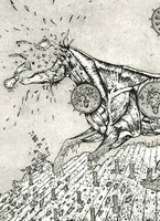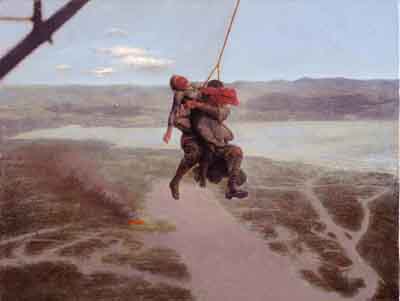 Ivan Fortushniak’s collages picture the intrusion of art historical divine and pastoral figures into photographs of WWII warfare, raising questions about the repercussions of mass-scale violence on both its vicitims and perpetrators. His use of romanticised and mythologized figures from Renaissance, Baroque, and 19th century American painting act as a startling counterpoint to the monochrome and mundane images of war, resulting in contemplative strangeness that encourages the viewer to consider the significance of violence in our history. This exhibition of Ivan Fortushniak’s work is one of 9 selected from among 151 proposals submitted for consideration for Manifest’s 12th season. Of his work the artist states: "My artwork integrates images of war with mix-media approaches in fine art while examining its moral, religious, and sociopolitical implications. Part of this research comes from various historical texts and documentaries including the images of Eric Hammel's book Pacific Warriors and Sir Jeremy Isaacs' award winning 1973 television series, World at War. Some of these images are appropriated from Renaissance and Baroque artists as well as late 19th century American painting. The combined processes are...an attempt to instill photography with the tactile and malleable characteristics of painting.” Ivan Fortushniak is an Associate Professor of Painting and Drawing at Indiana University of Pennsylvania and has exhibited extensively in the United States as well as abroad. His work was featured in Manifest's inaugural group exhibit, Terrestrial Domains, in January 2005, has been shown at Manifest in a prevous solo exhibition, and will be included in the forthcoming 5th International Painting Annual. He received his MFA in Painting from the University of Cincinnati.