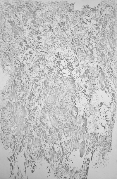 This exhibition of Laura Makar’s hand cut paper drawings is one of 8 selected from among 137 proposals submitted for consideration for Manifest’s 13th season. Eight of Laura Makar's cut paper drawings will occupy the Central Gallery. As cut paper the works embody both the fluidity of energy and the stillness of empty paper. As captured essences cemented by impeccable craftsmanship the works serve as a meditation on time, light, and persistent intentionality for both the artist and viewer. It is by coincidence that Makar and Kanwischer submitted proposals for the same season, and were scheduled for side-by-side exhibits at Manifest. As it turns out, Laura was Charles's student at Bowling Green. Not realizing this at the time, our curatorial interest was in how the two bodies of work relate (silent, concentrated, colorless, highly crafted and detailed) and how they contrast (very small, realism based on observed environments versus fairly large, abstraction based on observed ideas and impulses). We feel the two exhibits together make a perfect pair for experiencing and understanding the motives of the contemporary artist. Of her work the artist states: "LINE, a language of mark making that provides a visual to the physical consciousness. It is an ambiguous form, which is completely dependent on vision, and will remain so until used to form a construct. Upon construction, the ambiguity fades and a point of perception begins. It is able, in its delicate form, to be openly conspicuous in showing process, and that transparency will simultaneously prompt intrigue. The most beautiful aspect of line is that a line itself has no prior vision, no baggage, and entrusts itself solely to action. In these tendencies, line develops into shape. These shapes exist as static media transforming into movement. But, it is on the process, not the visual effect that my work focuses. The process creates an organic and obsessive deliberation; decision-making becomes intuitive and unconscious. Through continuous repetition the positive becomes negative; the small becomes large, and vise versa. It is the repetition that embraces the essence of documenting what I see on a daily basis.” Laura Makar was born in Buffalo, NY and grew up in Toledo, OH. She earned her BFA in two-dimensional studies at Bowling Green State University, in 2009 and her MFA in drawing at Wayne State University (WSU) in 2014. While attending WSU she was awarded the 2013 Thomas C. Rumble Graduate Fellowship, and recently received an award for her artwork at the 2015 MFAC Exhibition, Birmingham Bloomfield Art Center. Laura has exhibited her work locally and nationally; including exhibitions in California, Georgia, New York, and North Dakota. She was selected to be part of a two-person exhibition at ROY G BIV Gallery, Columbus, OH in late 2016. Currently, Laura serves as Preparator at the Elaine L. Jacob Gallery and Art Department Gallery, WSU. Learn more at: lauramakar.com