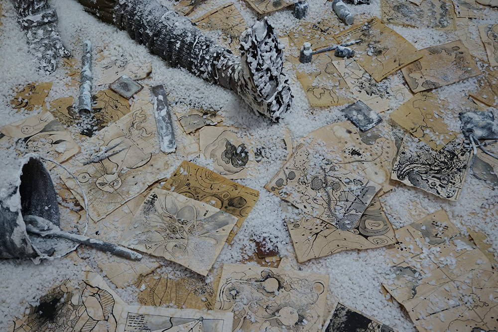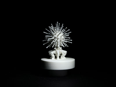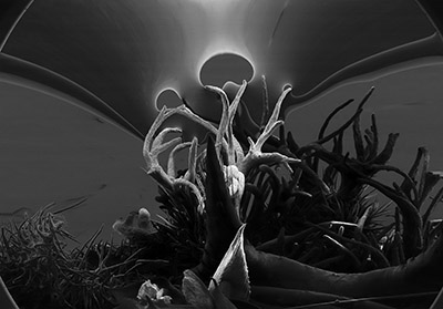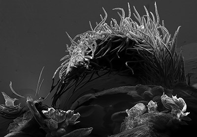 UMBRA Jess Holz (b. 1985) creates artworks which give the viewer a peek into invisible worlds, as well as a chance to reflect on the influence of scientific visual culture on our collective imagination. She has just received her MFA in Art+Technology at the University of Wisconsin-Milwaukee; previously she has worked in several labs and imaging facilities, gaining valuable technical experience with a number of microscopic imaging techniques. The discrepancy between what can be perceived by eye and what is imaged has fostered her fascination with perceptual systems along with the optical properties of materials. Jess actively exploits this in photography and installation. Of her work the artist states: "The wilderness has long symbolized unknown beasts and dangers, but it has also been a therapeutic place, a place to meet God. As a landscape, my work encapsulates the awe and terror associated with the sublime of the Romantic tradition—however, the sublime is associated with vast, expansive spaces. My work asks the question, what of the ‘tiny sublime’? This body of work is titled Umbra, after the darkest part of a shadow, since the worlds that I am imaging are not illuminated by light. These alien landscapes are, in fact, microsculptures incorporating insect and plant fragments, imaged by scanning electron microscopy. Lit with electricity instead of light, the sculptures present as post-apocalyptic wilderness, with radiant glowing forms and seemingly unstable dark areas, all rendered in excruciating detail. The monstrous forms inhabiting these scenes appear massive and immense, but in reality the entire landscape is less than half a centimeter across.” This exhibition is one of 6 selected from among 149 solo proposals submitted for consideration for Manifest’s 16th season.