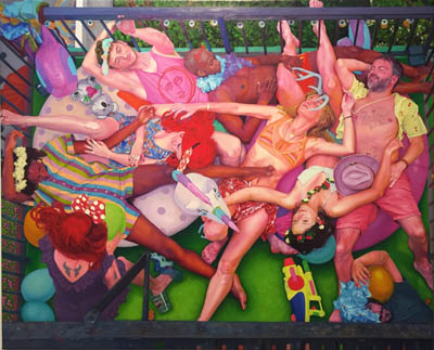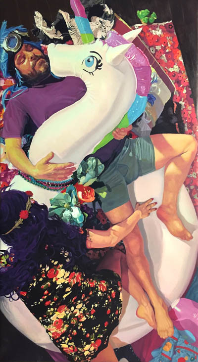 Of her work the artist states: "My recent paintings orchestrate multiple figures entangled with each other surrounded by inflatables and toys, painted in vivid colors with details of textiles, clothing and patterns. Away from any kind of negativity figures enjoy the moment; freedom and love despite all the threats surrounding them outside of their confined environment. But they are still aware of the short lifespan of that perfect harmony that will pop like a balloon soon. I use inflatables as a metaphor for our short lived contentment, the ephemerality of pure joy and happiness. They also represent the false sense of security, and question our constant drive for satisfaction and pleasure. Observing the loneliness and need for attention, accompanied with consumerism frenzy globally, my art evolved from being about my own personal crisis, to capturing the universal emotional state, especially during the current global and domestic social and environmental problems. ” This exhibition is one of 6 selected from among 149 solo proposals submitted for consideration for Manifest’s 16th season.