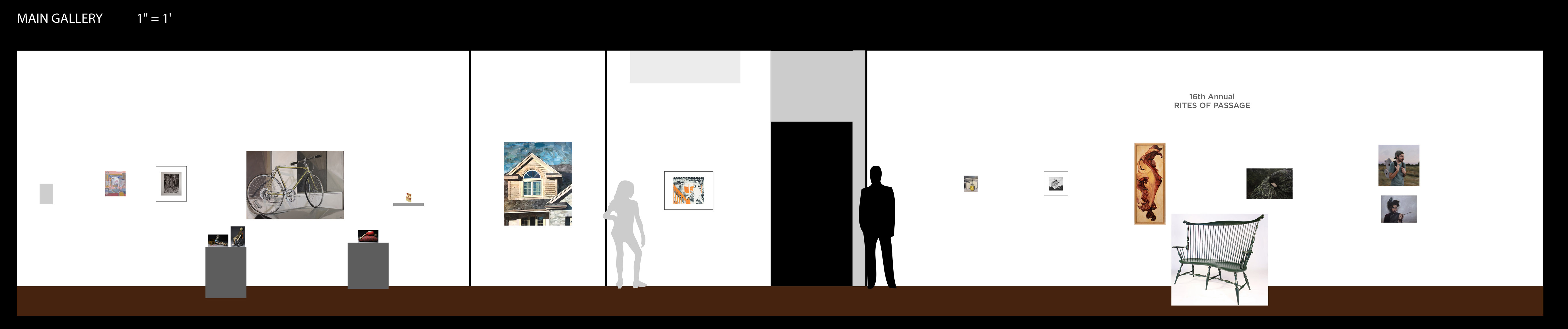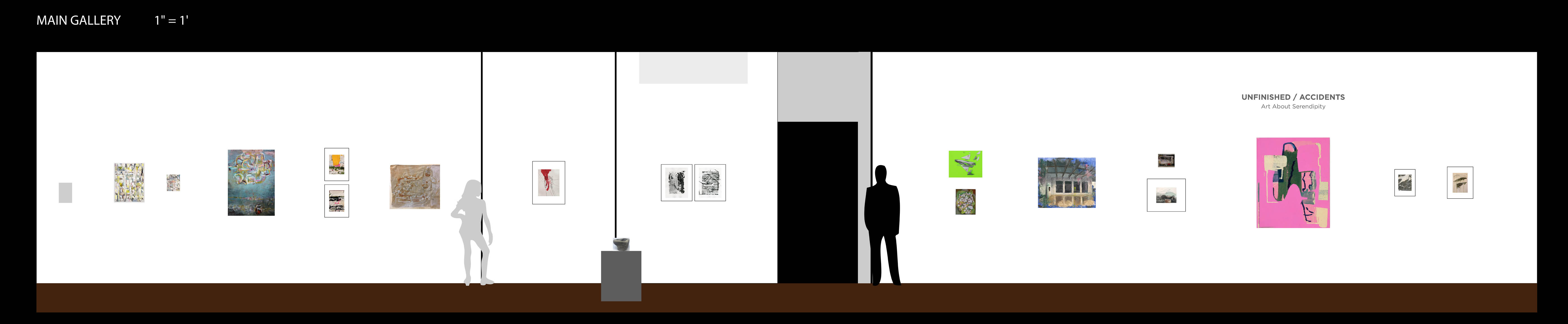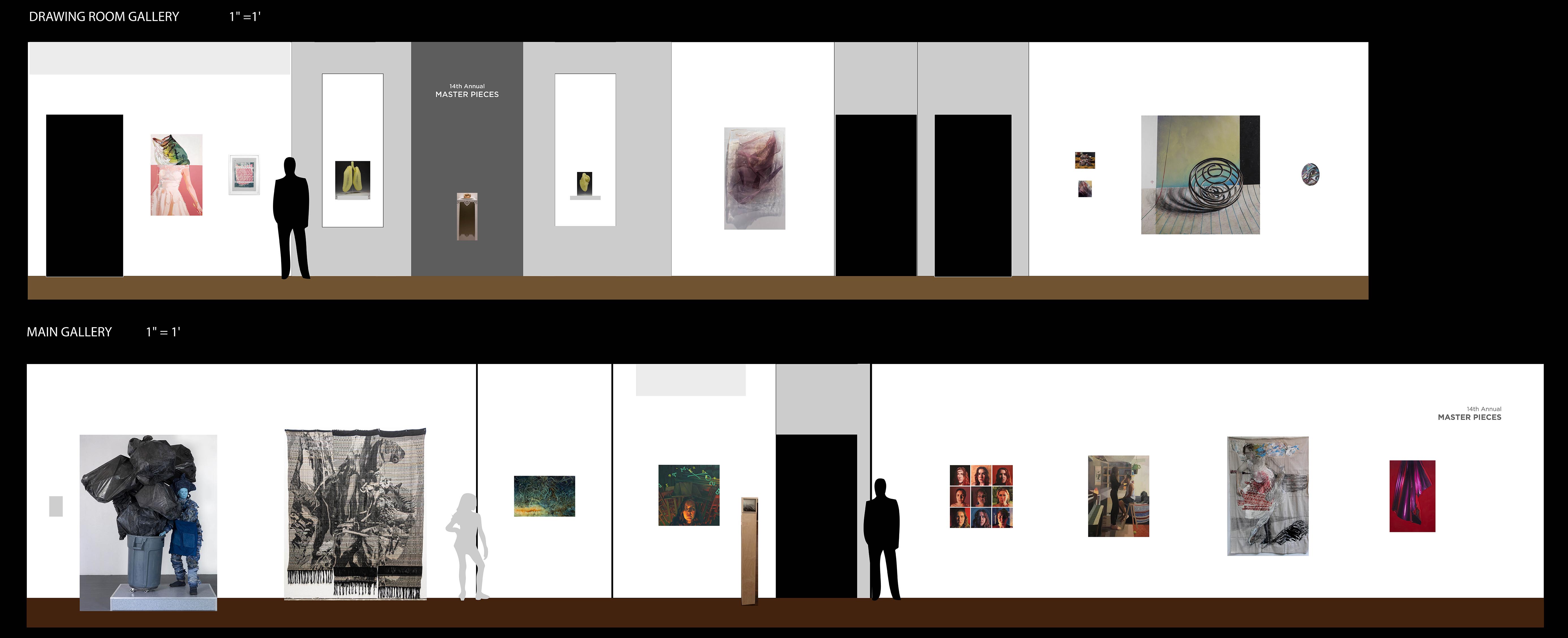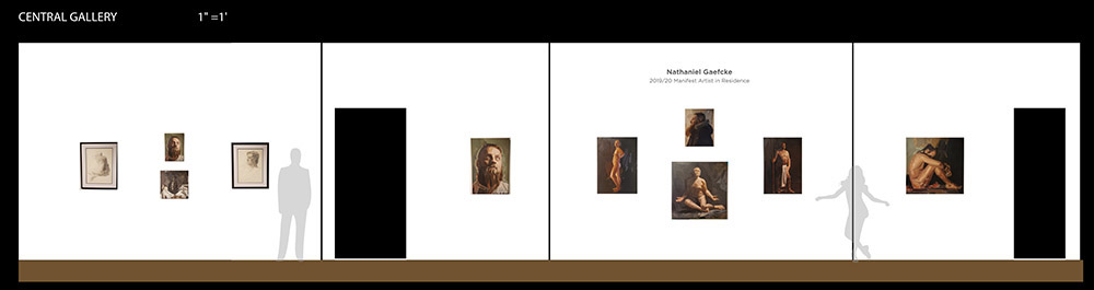 * The listings below represent our original exhibition plans (pre-COVID-19), space and layout designs, and artist lists for this exhibition period at Manifest. Due to pandemic impacts affecting artists and availability of works, on-site installations may vary from original plans. Some works will not be on view in the gallery. All jury-selected works will be featured online in social media features (Instagram and Facebook), included in our Manifest Exhibition Annual publication for season 16, and linked from this page before the exhibition's end. The scale model layout elevations provided below are the byproducts of our exhibition design process, typically for internal use only. We have chosen to offer them here to share our creative process and curatorial vision with the public and selected artists since many people will not be able to experience these exhibits in person. The above Manifest VR walkthrough represents the revised actual installation, including an 'absentee artwork' room sharing the ghosts of works not able to be sent to the gallery. All 66 works by 27 artists from 15 states and 3 countries are included. (Most works are available for purchase. Contact our staff with serious inquiries.)