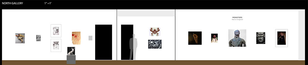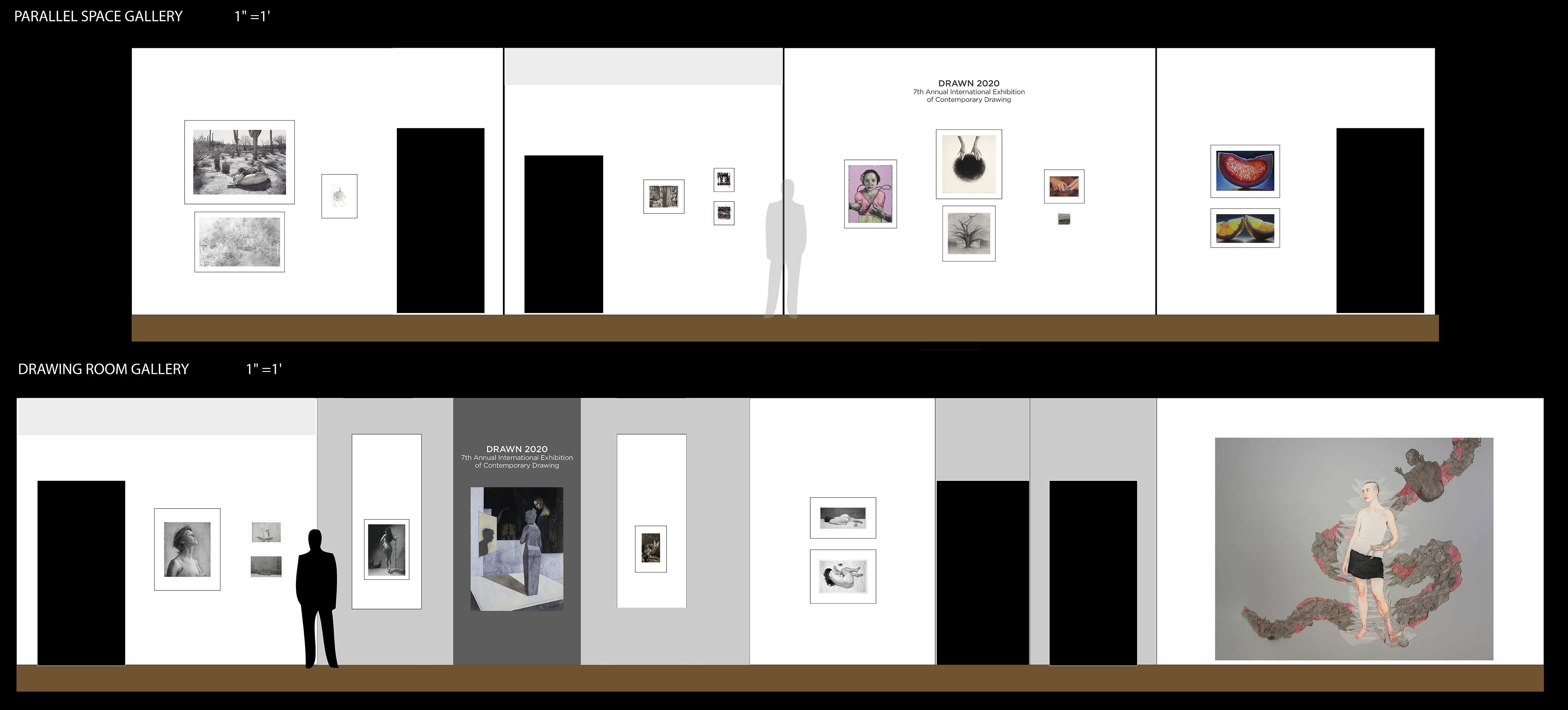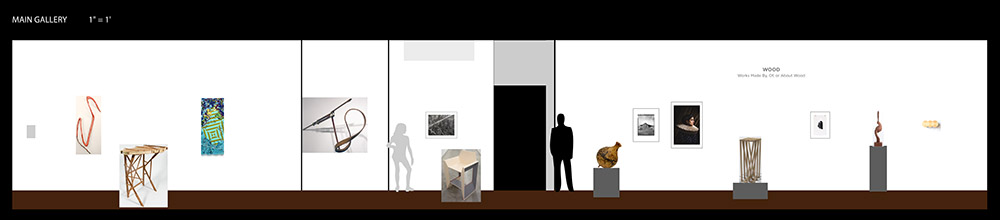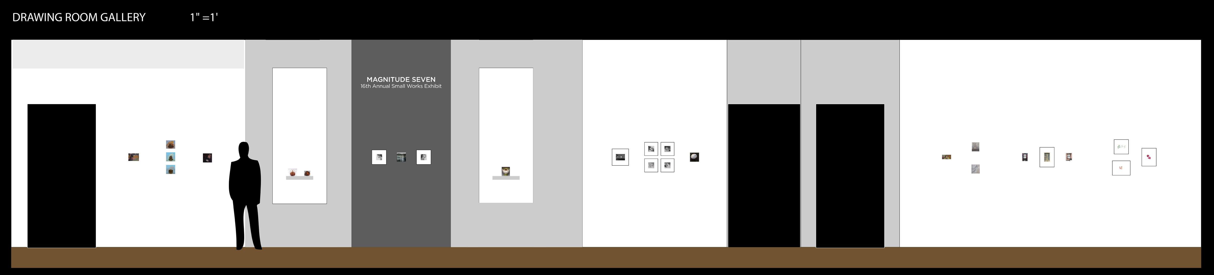 * The listings below represent our original exhibition plans (pre-COVID-19), space and layout designs, and artist lists for this exhibition period at Manifest. Due to pandemic impacts affecting artists and availability of works, on-site installations may vary from original plans. Some works will not be on view in the gallery. All jury-selected works will be featured online in social media features (Instagram and Facebook), included in our Manifest Exhibition Annual publication for season 16, and linked from this page before the exhibition's end. The scale model layout elevations provided below are the byproducts of our exhibition design process, typically for internal use only. We have chosen to offer them here to share our creative process and curatorial vision with the public and selected artists since many people will not be able to experience these exhibits in person. The above Manifest VR walkthrough represents the revised actual installation, including an 'absentee artwork' room sharing the ghosts of works not able to be sent to the gallery. All 66 works by 27 artists from 15 states and 3 countries are included. (Most works are available for purchase. Contact our staff with serious inquiries.)