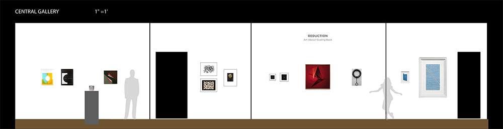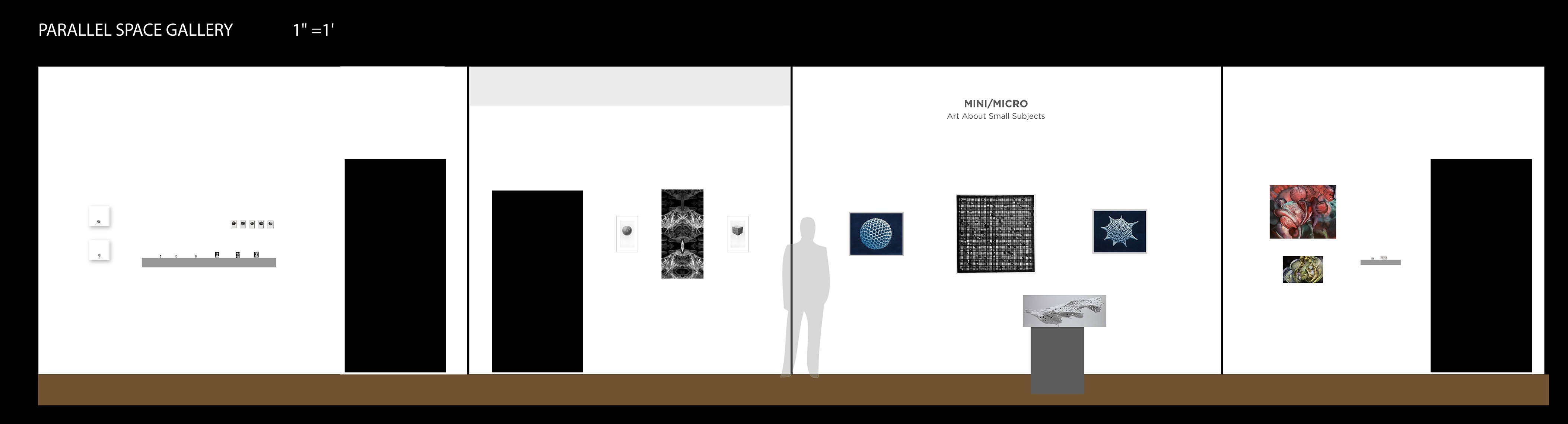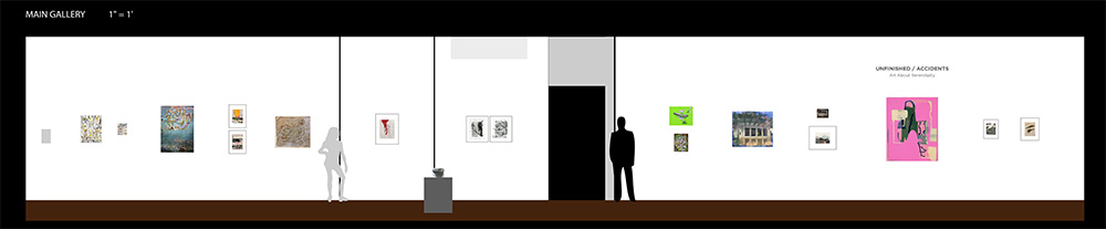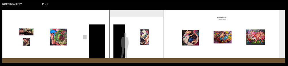* The listings below represent our original exhibition plans (pre-COVID-19), space and layout designs, and artist lists for this exhibition period at Manifest. Due to pandemic impacts affecting artists and availability of works, on-site installations may vary from original plans. Some works will not be on view in the gallery. All jury-selected works will be featured online in social media features (Instagram and Facebook), included in our Manifest Exhibition Annual publication for season 16, and linked from this page before the exhibition's end. The scale model layout elevations provided below are the byproducts of our exhibition design process, typically for internal use only. We have chosen to offer them here to share our creative process and curatorial vision with the public and selected artists since many people will not be able to experience these exhibits in person. The above Manifest VR walkthrough (coming soon) represents the revised actual installation, including an 'absentee artwork' room sharing the ghosts of works not able to be sent to the gallery. All 58 works by 44 artists from 20 states and 3 countries are included. (Most works are available for purchase. Contact our staff with serious inquiries.)