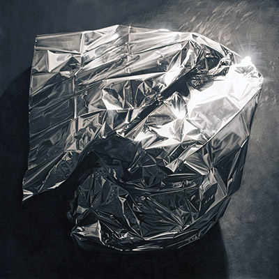 "In my paintings, I examine the present day through the lens of past predictions dating from the 1950's - 1980's. These forecasts, found in scientific journals and science fiction, saw beyond the year 2000 to a variety of outcomes whether hopeful or fearful of the future. Some theorists wrote of the potential for space travel, new technologies, and stability of life while others predicted a darker turn in nuclear annihilation, fear of the unknown, and a continuing lack of resources. Now that we exist within this future, we are able to see that very few of those outcomes took place directly, yet they set into public awareness the dangers and positive innovations that were becoming possible as time advanced. So, while neither prediction was necessarily true, elements of each did occur. I am interested in portraying these fantastic events alongside painted representations of everyday household items that act as symbolic tokens and serve as access points to the intangible.