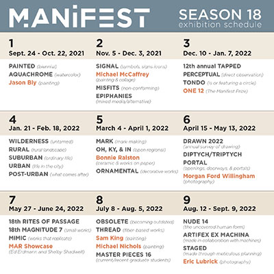 Pre-order the season-documenting hardcover anthology, the Manifest Exhibition Annual (MEA s18). Download to save or print the entire season 18 calendar here. |