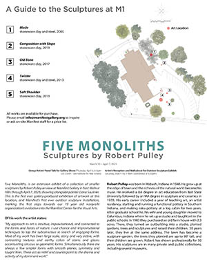 **Note that concurrent with this show, Pulley's large scale ceramic work comprises Manifest's first ever outdoor sculpture exhibition at our new campus at 3464 Central Parkway as an extension of this intimate gallery exhibit. An artist's reception for Five Monoliths will be held during a building-wide spring open house on March 18 from 5-9pm (with an artist's walkabout at 6:30pm weather permitting). More info. Pulley also has a major display of large sculptures on view at the Krohn Conservatory in nearby Eden Park through June 18, 2023. A guide to Five Monoliths at M1: