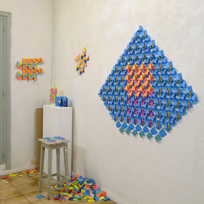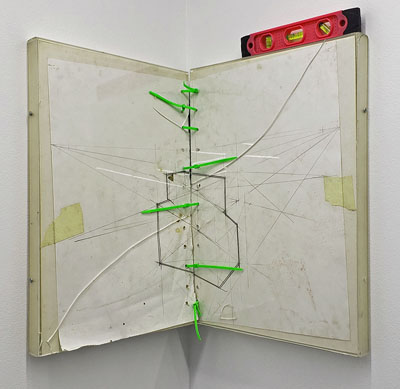 Occasionally we opt to conduct a playful experiment in our galleries in collaboration with artists who have responded to our invitation, testing ideas in real time, and observing the results. Displayed together in one gallery these sibling shows called for works engaging with the ceiling, the wall above our heads, or anywhere above the gallery-standard 60” eye level for Up High, and below 60” or anywhere in the space below our eye level for Down Low. In this way we divided the gallery in half horizontally between upper and lower. For this experimental pairing of two exhibits in one space 33 artists submitted 81 works from 21 states. Six works by the following 6 artists from 6 states were selected by a blind jury process for presentation in the gallery and the Manifest Exhibition Annual publication. Presenting work by: