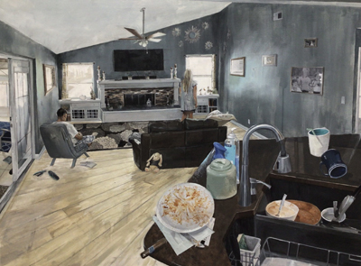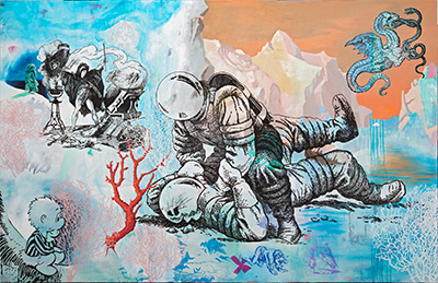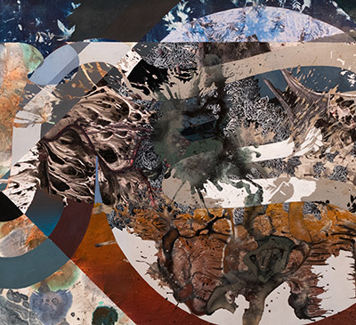 The Hollows Are Now The Home Adrian Hatfield makes work examining the visual language strategies of science, pop culture and fine art history in conveying unfathomably huge subject matter. Recently, his focused has narrowed to address the overwhelming reality of our unfolding environmental catastrophe. His works are included in the public collections of The University of Michigan, The South Bend Museum of Art, Northern Arizona University Art Museum, and The University of Iceland in Reykjavik, Iceland. Solo exhibition venues include Manifest Gallery, Cincinnati, OH, The South Bend Museum of Art, South Bend IN, ARC Gallery, Chicago, IL, and Biggin Gallery, Auburn University. Two-person and small group exhibitions venues include The Butchers Daughter, New York, NY, Jeffrey Leder Gallery, New York, NY and Jack the Pelican Presents, New York, NY. Publications include The Manifest Press International Painting Annual, Fresh Paint Magazine, Studio Visit Magazine and Essayd. Of his work the artist states, in part: "My research is fueled by anxiety about our current environmental crisis, and it reflects an attempt to understand these events through the lens of geologic time while simultaneously criticizing our present-day response to them. While society is understandably dismayed at the prospects of rising oceans, shrinking agricultural production, increased natural disasters and mass extinction, it is also true that the processes of life and evolution will continue with or without us. New ecosystems will emerge and new species will thrive. There is hope in the realization that the natural world is bigger than us. The intention is for my paintings to convey those experiences in tension: dread, splendor, joy, terror, wonder and the absurdity of human inaction. Their iconography samples and recombines elements from art history, illustration and satire, with a goal of existing somewhere between a requiem, a science fiction fever dream, and a call-to-arms.'” This exhibition was selected from among 182 proposals submitted in consideration for Manifest’s 19th season.