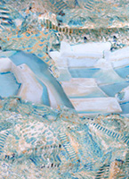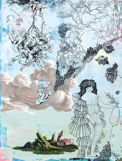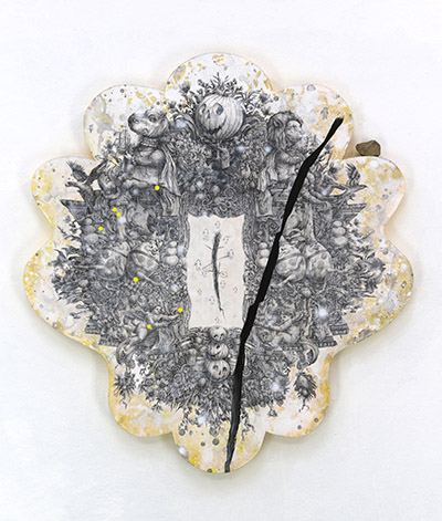 Katherine Tzu-Lan Mann Memory Palace Of her work the artist states: "I examine landscape painting, environment, and cultural estrangement by building luxuriant, cinematically scaled paper paintings and installations. These combine romantic, utopian and immersive sensibilities from both Chinese and Western landscape painting with a lexicon drawn from a personal mythology informed by my identity as a biracial, second generation Asian American: ribbons, baubles, bats, peaches, sperm, piles of flowers repeated so many times as to appear biomorphic and alien, but bursting with incongruous efflorescence. These pieces have two primary concerns: the exploration of landscape in a world where "landscape" is defined through an ever-widening field of digital, graphic, and visual forms, and the insertion of personal world building—a world of fragmentation, hybridity, and incongruity—into that history."