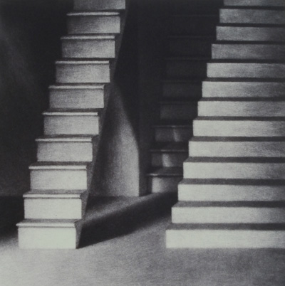 STAIRS (Part of the Season 19 Five Themes Project) Stairs are a transitory space in a home, dividing it into distinct spheres; downstairs for company, upstairs for family. Further up, maybe, into an uninsulated attic. Further down into the cold of a cellar. Or, they are the thing (or place?) that guides you from outside to inside, up to your hallway, your doorway, preparing you to enter your home. Or, to the beach or up the mountain, to the subway or classroom. They can be grand, ornate, theatrical. They can be strategically hidden, in corners and behind doors. How much time is spent on stairs? What kind of time is spent there? What does each step mean on the way up, or down? How many are there? A stairway is intended to lead you somewhere—but what about when they become a barrier instead? Stairs are not a room, but they are a space. What inhabits a stairwell? What accumulates on them? What lives beneath? STAIRS is an exhibit about such transportive structures, and the idea of moving upwards or downwards through spaces and places. For this exhibit 23 artists submitted 62 works from 15 states. Twelve works by the following 6 artists from 6 states were selected by a blind jury process for presentation in the gallery and the Manifest Exhibition Annual publication.
