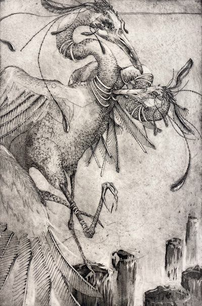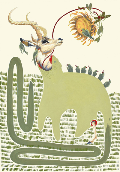 Of her work the artist states: This sense of adventure is built by combining my improvisational animist daydreams with honed technical skill. Improvisation allows for joy to seep into my work. I start only with a few guiding intentions (inspirational imagery, a few lines drawn by a friend, limited palettes, and/or a response to a previous piece) and then I play until the work is finished. This can be successful only because I believe in the worlds I create. That they are living breathing worlds. That I have only captured just the barest of glimpses of. They have stories and movement beyond what I could ever imagine. And are greater than the sum of their parts."