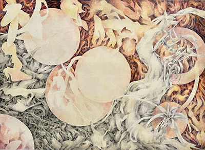 Hanna Sosin is an artist and art instructor currently based in Cincinnati, Ohio. She holds a Biochemistry BA from Earlham College (2015) and will be pursuing her Studio Art MFA at Northern Illinois University starting Fall 2023. Hanna's drawings and paintings sew together the edges of biology, fantasy, and humor into unexpected narratives and worlds. With her art, Hanna attempts to glimpse beyond her own world and into others where exploration is a caring act. Her award winning works have been displayed both in group and solo shows throughout Michigan and Ohio. She was Manifest's Scholar in Residence in 2021-22 and Artist in Residence for the 2022-23 season.