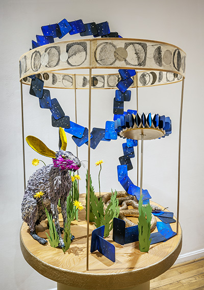 Of her work the artist states: "Animals have an instinctual flow within the balance of their particular ecosystems. Each has their own remarkable intelligence and skills, bound in the instinctual knowledge that is the book needed to teach future animal generations. Recent animal tableaus have included an abstraction of a book form that contains pieces of this instinctual and experiential creature knowledge. The books, placed within the animal environments contain suggestions of migratory maps, daily paths, flora, fauna, and relics from their habitats. I strive to give each animal a presence of intelligence and dignity in their way of life. All of these animals are impacted by human lack of deference to the delicate balance of nature. We know that the animal pathways, created over thousands of years and generations, are at risk globally. These portraits of animals in their environments are meant to remind us of our own ancient origins and the positive and fruitful acknowledgment of animal power and coexistence that is at the roots of human culture.” This exhibition was selected from among 182 proposals submitted in consideration for Manifest’s 19th season.