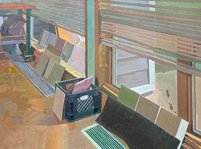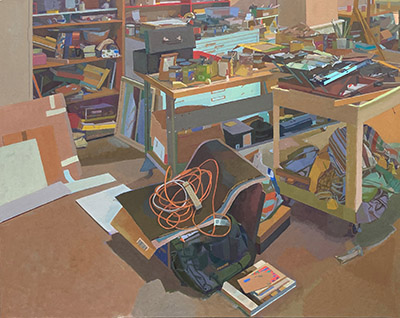 The paintings are about a particular feeling for light, space, and color. The work is begun with excitement for light in the studio, a strong sunny day filtered through the skylight and the green trees outside the windows. The color in the painting aims to be expressive of strong fauvist-like colors that I sense as I look, yet the colors are mixed down so to hopefully express both the colors and the weighted planes of the room and the objects. It is my desire that a viewer would spend time with the work to experience the color which has been muted and suppressed. I want a weighted Fauvism with the work. A convincing feeling of gravity and space creates a convincing feeling of compression in the paintings. The gravity and compression attempt to justify the impressionistic blush of color and light. The title of this show, 'Octopus's Garden', was taken from my painting with the same name, which was inspired by a documentary film titled 'My Octopus Teacher.’"