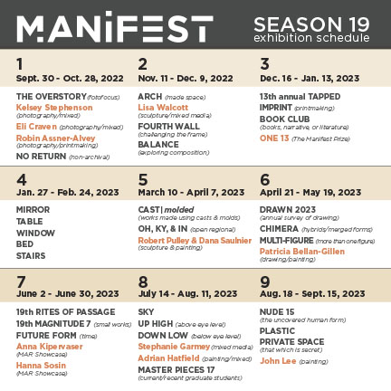Pre-order the season-documenting hardcover anthology, the Manifest Exhibition Annual (MEA s19). Download to save or print the entire season 19 calendar here. |