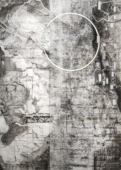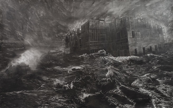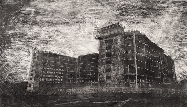 HORIZON Born in New Brunswick, NJ, Kasey Ramirez received an MFA in Printmaking from Indiana University and a BFA in Illustration from Rhode Island School of Design. She currently lives and works in West Hartford, Connecticut, where she serves as Assistant Professor and Head of Printmaking at the Hartford Art School. Her work has been exhibited at the International Print Center New York, The Morgan Conservatory in Cleveland, OH, 21C Museum in Bentonville, AR, Rosewood Arts Centre Gallery in Kettering, OH, and the Center for Contemporary Art in Bedminster, NJ. She is a recipient of an Artists 360 Grant from the Mid America Art Alliance, for which she is pursuing research on climate change and hazard mitigation efforts to inform her work. She has participated in artist residencies at Arquetopia in Urubamba, Peru, Collar Works Elizabeth Murray Artist Residency in Granville, New York, Vermont Studio Center, as well as Guanlan Printmaking Base in Shenzhen, China. Of her work the artist states: "My work explores the tension between stability and impermanence by placing architectural structures in consuming environments. In the wake of increasingly frequent severe storms, and having direct experience with Superstorm Sandy, my personal sense of vulnerability connects with the impending tipping point of climate change. In my drawings and prints, buildings become a stand-in for human efforts for protection that are ultimately vulnerable to environmental extremes. I enjoy the alchemical properties of printmaking—how the surface of wood can become air, to be at once an assertively flat surface and a spatial, breathing image. I find the processes of physical erosion or destruction resonate with the features of these disasters. Drawing also allows me to explore this sense of devastation and looming atmosphere. By using charcoal, soot, ink, and other organic residue in these works, the drawings reference their subjects—oppressive air, water, or destructive fire. I seek to create a sense of time and turmoil through repeated gestures of accumulation and removal.” This exhibition was selected from among 166 proposals submitted in consideration for Manifest’s 20th season.