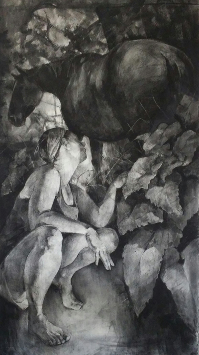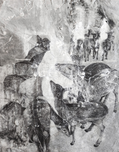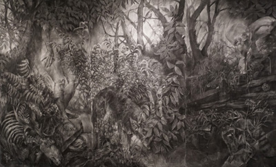 Where the Light Comes In Melanie Johnson is an artist and an educator. Born in Kansas City, Missouri, Melanie earned a BFA in Painting from Missouri State University (2003) and an MFA in Painting from the Henry Radford School of Art at Indiana University, Bloomington (2006). She is currently Professor of Painting and Drawing and Chair of the Division of Art & Design at the University of Central Missouri. Her large-scale charcoal drawings recall sensory and emotional connections to animals and the natural landscape. She lives in Prairie Village, Kansas. Of her work the artist states: “My drawings recall the sensory and emotional connections inherent in my bonds with animals and the natural landscape, and the ways in which animals provide some of my earliest empathetic relationships and routine caregiving experiences. Examining these formative bonds has caused me to return to the physical and psychological landscapes connected to the life cycles of animals, and has made me increasingly aware of the existential parallels and patterns in human behavior. Mining the imagery of familiar landscapes gives form to a dissonant accrual of lived experiences, personal iconography, loss, and sense of place. I think about the relationship of time and narrative selection when making drawings, both in terms of constructing a story through representational imagery, and in the tactile manipulation of materials to communicate an idea. My drawings serve simultaneously as narrative vehicles and as physical artifacts that reference the history of their own manifestation, giving agency to narrative conceit and suspension of disbelief, but also providing a connection to haptic and emotional experience. Surface palimpsest, the layering of marks over time, and indexical mark-making are active metaphors in my work. I want to be present through the physicality of the drawing as both storyteller and protagonist.” This exhibition was selected from among 166 proposals submitted in consideration for Manifest’s 20th season.