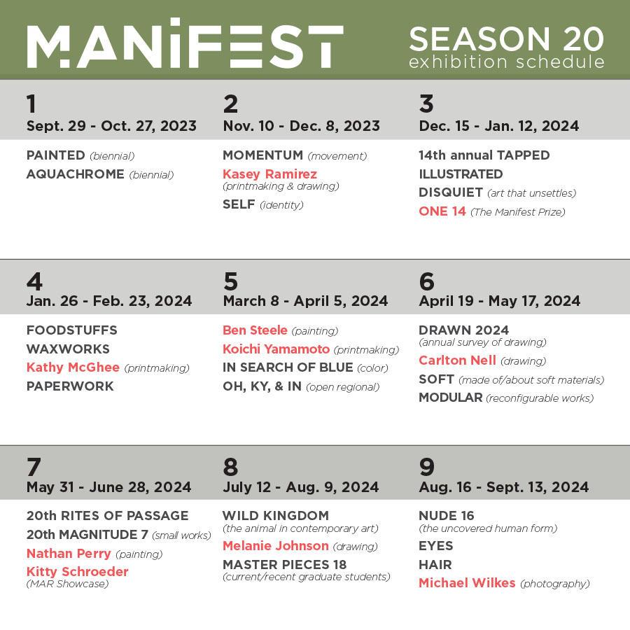In 20 seasons Manifest's projects have included works by artists representing 50 states and 48 countries. Beginning in our tenth season, we launched an ongoing series of exhibits focusing on works by artists in our three-state region. Nine years ago we added projects that also focused on other definable regions outside our own. These Regional Showcases were offered to complement the very wide geographical makeup of most Manifest exhibits with a closer look at art being made here in our own backyard, as well as provide a platform from which we could examine the trends, qualities, and idiosyncrasies of contemporary art within specific geographical areas and compare them to our own. As is the case every season, this exhibit had no specific requirement for type, media, or style of work to be submitted. This was an open call. Submissions ranged widely from traditional to very conceptual, abstract, and experimental work. Jury selections were made based on the overall quality of the works submitted. For this exhibit, 195 artists submitted 798 works from Indiana, Kentucky, and Ohio. Twenty-two works by the following 16 artists from our three-state region were selected by a blind jury process for presentation in the gallery and the Manifest Exhibition Annual publication. Presenting Works by: Kristina Arnold Mary Fashbaugh-Bean Frederick Fochtman Frank Gwirtz Lee Heinen Uhma Janus Anna Kruse Renee McGinnis William Olsen Kathleen Pahl Jesse Payne Jinblossom Kim Plati Kyle Ragsdale Lisa River Schenkelberg Caitlin Talmage Travis Townsend