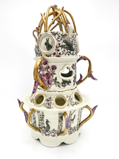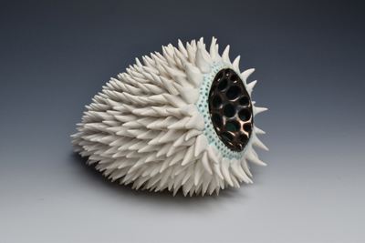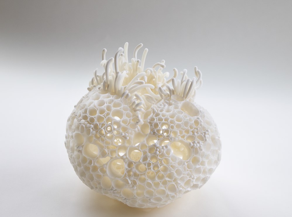 Her work has been shown nationally and internationally, including exhibitions at Yellowstone Art Museum, MT, San Angelo Museum of Fine Arts, TX, Evansville Museum, IN, Zanesville Museum, OH, McConnell Art Center, Ohio Craft Museum, Cultural Arts Center and China. Of her work the artist states: "My identity as a mother and caregiver is intertwined with my role as an artist. Understanding the behavior of materials and using processes akin to domestic tasks fosters a sense of familiarity with forms and muscle memory. This enables me to engage with the nuances of the materials, their responsiveness to my hands, and the fusion of clay shaping and the use of kitchen tools in my creative process. My work traverses the domestic realm through the use of tools and themes centered around pregnancy, children, and motherhood, interwoven with memories and traditions from my life in China. In my recent artworks, I draw inspiration from the natural forms of organisms and integrate them into sculptures crafted from polymer clay. By capturing the dynamic shapes and intricate details of nature, rooted in my childhood memories, I convey the diverse emotions and states experienced by women during their journey of growth. My artworks invite viewers to explore the hidden complexities within the monochromatic surfaces.” This exhibition was selected from among 164 proposals submitted in consideration for Manifest’s 21st season.