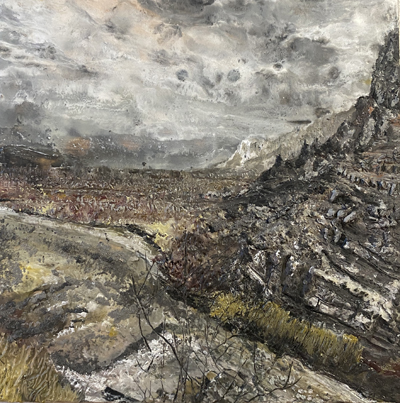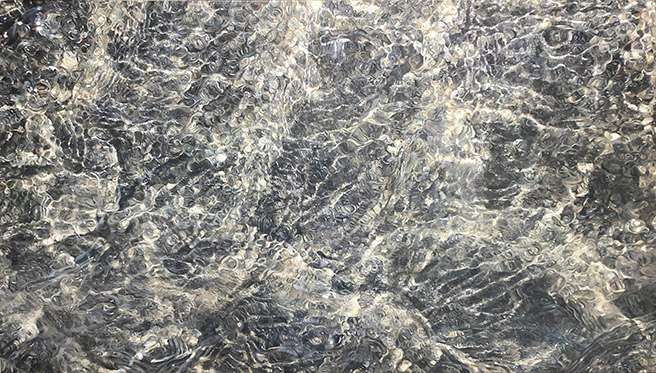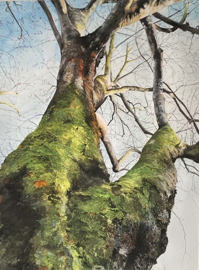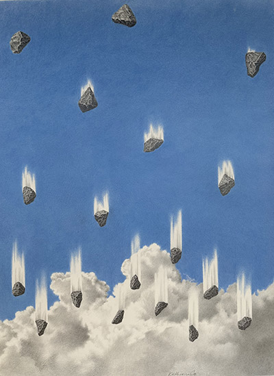Of her work Cox states: The act of laying graphite down onto paper is personal, intimate, and immediate. It is just me, the pencil, and the paper. When I put pencil to paper there is no disguise, no veneer. The clatter of life is distilled into quiet simplicity the moment I begin. My inspiration comes from the natural world. Rocks, sticks, trees, and rope fascinate me not only in their simplicity as objects, but in how they can address the complexities of the human condition. Most recently the expanse of skies, water, and wind has captivated me. I can hold a rock or a stick. I can rub my palm along a tree trunk, I can feel the coarse fibers of rope. These are objects I can contain. A fast moving river, the depths of the ocean, cloud formations illusively changing with the wind—these I cannot contain and I am reminded that I am small. Drawing these ever-present natural objects and scenes through intense observation quiets me and connects me to both the grandeur and frailty of life. Graphite and colored pencils are my primary tools, and paper is integral to the image, not simply the surface which holds it. Paper surface and marks synthesize, yielding a single seamless result. The interaction between tool and surface is alive and vital, bringing forth imagery.