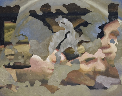 Of his work the artist states: "The T-Square in this painting belonged to my grandfather William Schickel whose modern artistic career spanned architecture to photography sculpture and painting. I never saw a traditional office space as a kid but my grandfather’s studio with its rulers, tracing paper, paint and bent metal was my example of what a working person looked like. Always busy, my grandfather’s mantra was art is life—life is art, which fit a moral view of the world informed by his Catholic faith. Aesthetics and rightness were synonymous pursuits that I had to untangle in my own development as a mature artist, but the ease of making and looking at the world through an artist’s lens is a kind of permission I am thankful to have been given. I teach at the University of Cincinnati and have spent some time working with fashion design students. Basic materials are inherently beautiful to me, and even though I marvel at how my design students can craft and detail garments, the fabric itself is where I see the most magic. This painting is simple: expanses of gold and blue fabric divided by a T-Square. It’s not meant to be topical, but if you think it is, well that’s lovely too."