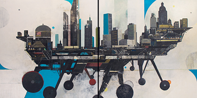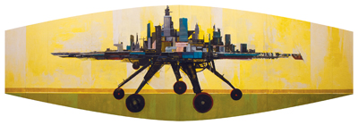 Of his work Westmark states: Since the early 60’s, the idea of mobile cities – whether flying, floating, rolling, walking or otherwise – have been proposed by both architects and science fiction authors as either a solution to the challenges faced by the static city of today, or as the ultimate survival vehicle of the future. Whichever the case, this work asks you to suspend for a moment all practicality and consider a city untethered to terra firma, capable of moving on its own, dodging catastrophe or hunting new resources. Suppose for a moment that Sendai City could have rolled to higher ground before the tsunamis reached the coast. What if Staten Island could have simply gotten up and walked out of Superstorm Sandy’s path? Ultimately, after each catastrophic event, against the standard orthodoxy of rebuilding, is the fleeting revelation of an outlandish mutation.