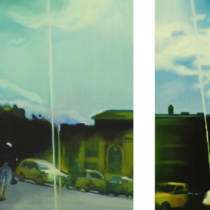 'Market Hall Corner' is based upon five isolated film frames from a second of footage that marks the passage of time. However, the five panels are not presented in strict sequence, but instead rely on the spectator to make the link between one frame and another. Although the painting is not photorealist the photographic lens flare has been utilised to reference the original source.