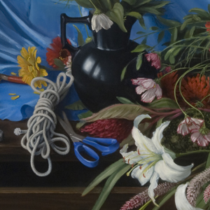 These three works were all done from life in my studio. It is a 19th century apartment, with a large fireplace and tall windows and ceilings. Well past it's former glory, the apartment is filled with my tools and the miscellaneous objects I collect for still life subjects; also, with flowers (alive, dead and some long-dried), art books, and photographs. Painting from life, working only by northern light, is one of my favorite ways to work, but I am not a purist. Any source will do, if it provides an image I want, and my fidelity to that source can vary. A still life arranged or found in the studio may result in a painting that looks just like it; but that is rare, for me. Perishable things, like flowers or food, are constantly replaced, requiring imagination to knit last week's portion together with this week's. Imagination is more than a simple tool, though: it is the partner of observation; together they are the true source of any satisfying painting. Doing well with both at once requires very close attention to the internal world, as much as the external. Painting is a slow process, allowing much reconsideration; it is hard to know if I ever have it right. The passage with the fireplace mantle in "Still Life With Flowers" is simpler now than it was the first time I painted it. Then, it showed the mantle covered by a pile of clutter: a clip-on lamp, an extension cord, a drafting compass, several large envelopes, and a postcard of a Frederic Church painting showing Cotopaxi erupting. It took several days to paint all that, and I was pleased with it. After realizing that it had to go, I was surprised at the amount of paint required to cover it up.