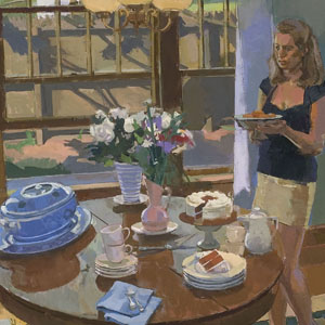 For roughly ten years I have painted subjects that surround or are contained by our Craftsman home on Lincoln Street in Bloomington, Indiana. This work has resulted in a series of interiors, still lifes, town landscapes and figure compositions revolving around these subjects. The house has been my leitmotif. How light and air permeate and surround it have seemed incredibly important to me. I think of the characters in the paintings as being stand-ins for my partner and myself; figures arranged against and within its spaces mirror our life together. I record the pleasures afforded by stacked rooms glimpsed through doorways. As a painter, the envelope of the space and the domestic atmosphere are as important to me as the figure itself. The figures re-enact the quotidian activities of our daily lives as people cooking, sleeping, eating, reading, games, bathing, sex. In a larger sense, I feel that I am painting the world in ways that emphasize the qualities of the "natural" and the "intimate."