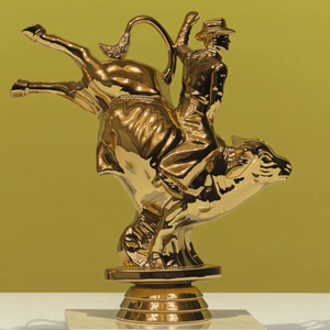 Trophies play a major role in American life. Capitalism is essentially rooted in the idea of winning. Trophies are the carrot leading the horse, a symbol of hope and desire for the ninety-nine percent. These paintings envision our trophy-world – shiny and superficial. The metal, however, is an illusion, spray-plated plastic, no real weight - an apt metaphor for a country that no longer manufactures anything. All of these figures are proudly standing on a marble base - symbolic of our institutional traditions. In reality, these trinkets are no more than six inches high. The paintings enlarge the figures not to human size, but to half human-size as if they are desperately trying to assert their importance. The various figures are used to represent different aspects of our society. The rodeo trophies illustrate our romanticized past – the wild west in all its rugged testosterone-soaked glory. The cheerleaders embody our obsession with sports and its accompanying misogyny. The motorcross statuette typifies our love of speed, daredevils and gasoline. The bodybuilder pokes fun at the prevailing image we have of our country as mighty and heroic as well as demonstrating our preoccupation with physical beauty. Finally, the policeman depicts the country's need for excessive security just to live "freely" today. Another narrative is created in the paintings when the viewer becomes aware of my reflection occurring throughout the trophies. The mini-self portraits acknowledge my own desires for success as well as my participation in the system I purport to critique.