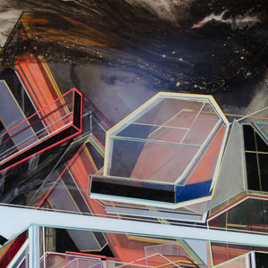 My art focusses on our world and the split of experiences that we have simultaneously through our perceptions of the "real" and the "virtual." These experiences have grown at an expansional rate as our technology both acts as a vehicle that binds us though global connection and the ability to annex our brains and yet creates a displacement in our physical lives. I use painting, a nonlinear yet simultaneously experienced medium to explore an abstract interpretation of our contemporary "landscape" or a more appropriately termed "visual scape". I create layers of information separated by literal coats of poured transparent medium. In between these layers are ridged hand stenciled spray painted lines. I am both removing the idea of a singular artists hand by referencing commercial and digitally designed signifiers in a very controlled and deliberate process but simultaneously make these virtual references material.