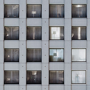 In my ongoing series "Hollow City," I explore spaces that have been created by the frenzied development of the contemporary city. This architectural environment that is within and between hi-rise buildings has become a frontier, a boundless space of geometric forms, mirrored surfaces and transparent windows that are distant from the pedestrian perspective. Photographed at night, the city is revealed gradually with exposures that last several minutes. Light, radiating from within and below, is essential to my images. The city is given a sense of transparency and ambiguity, a place where presence is created through absence.