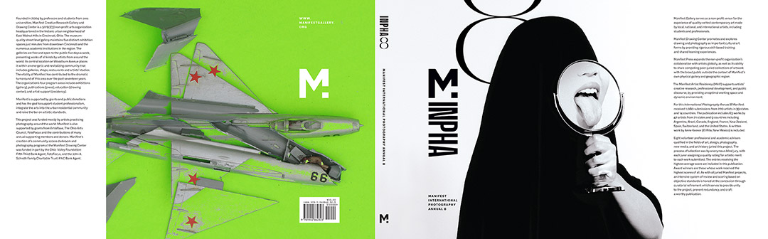 For this eighth International Photography Annual Manifest received 1,080 submissions from 220 artists in 39 states, and 14 countries. The publication includes 63 works by 42 artists from 21 states and 9 countries including Argentina, Brazil, Canada, England, France, New Zealand, Spain, Switzerland, and the United States. A written work by Anne Keener (El Rito, New Mexico) is also included.