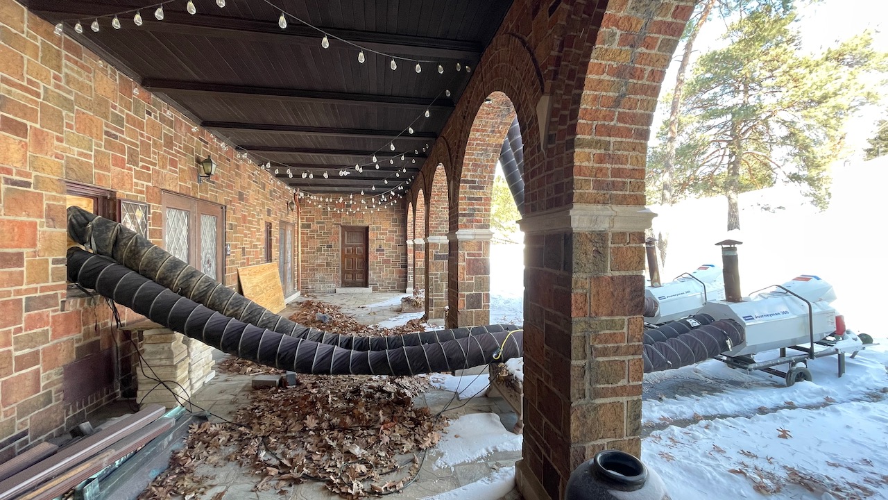 Phase Two all along had as one of its primary goals the complete update of HVAC in the building. This includes replacing the failing 100 year old boiler system with high efficiency zoned systems suitable for 24/7 studio activity, public comfort, and artwork care. Phase Two has yet to be fully funded, and so has not yet begun. However, in January 2026, during one of the coldest extended sub-freezing periods in many years, the building's boiler failed completely and irrevocably. This forced our staff, board of directors, and technical advisors to make the difficult decision to implement the emergency temporary heating shown above, supplying just our two main studio spaces with warm air, rather than cancel all programming until warm weather. This image of a building on 'life support' illustrates the urgency of Phase Two being funded and completed on time. Image: January 2026.