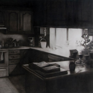 By using subtractive approaches within my charcoal drawings, I am able to more vividly create a sense of light through erasing. This is important because this eradication mimics the effects of cast light, specifically the intensity of its source. Light owns the capacity to eradicate space as well as maintaining the ability to shape, bend, and depict. The more detailed and realistically light is depicted, the more light becomes something of abstraction, lending itself to its beauty and daunting nature. I believe this character, in conjunction with monumentally scaled interiors, touches upon the sublime a feeling made evident when viewing contrasting notions of reality, the real beside illusion.