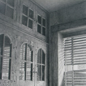 My three graphite drawings were inspired by the Eyreville Plantation; an old plantation on the Eastern Shore of Virginia. The owner of the plantation was gracious in allowing me access to his property for a photo opportunity. He not only showed me around the grounds and inside the many buildings, but also shared stories about the property's past history and occupants. Eyreville is a hidden gem of several hundred acres situated along water and marsh, surrounded by vast open fields. The once beautiful and bustling plantation is now silent and in disrepair. The main house is enveloped in an eerie calm. I felt the stillness and beauty of the structure held the mystery of memories past. What was once vibrant, is now surrounded by an aura of sadness. Passageways and furnishings echo reminders of those who lived and loved within its walls. I have tried to convey this atmosphere in my drawings while, at the same time, instilling the warmth and beauty that once existed.