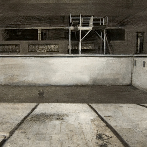 I make large graphite and charcoal drawings to enhance the feeling of deadness, emptiness, and abandonment. The simple black and white contrast functions as an abstract structure in which to consider composition and an emotive style of mark making. Formally, I attempt to contrast active and gestural marks with spaces that flatten out, and empty paper with areas covered in layers of graphite.