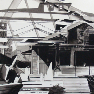 This recent body of work focuses on the aftermath of both man made and natural disasters. I have appropriated many of these photographic sources from Google image searches and taken images on location myself. I archive, then digitally collage the photographs in preparation for the paintings. I situate these images somewhere in between abstraction and representation in order to create a dialogue with modernist painting through postmodern practice. I draw and paint these images not only to further slow them down, but to also support traditional notions of the "sublime landscape," one that is uncontrollably vast and frightening, within a contemporary context of anxiety and fear. I am both drawn to these images and repelled by them. They speak of a time where agenda setting, political rhetoric and consumption are perpetuated and often manufactured by the media. As mass media sets the psychological and emotional tone for life as we know it, I work in an attempt to differentiate neurosis from my own understanding of reality.