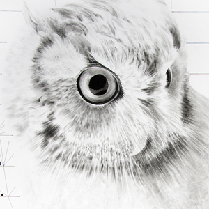 In ink and charcoal drawings, I have begun to explore how best to represent the process of imprinting on birds. This drawing features an imprinted screech owl and incorporates atmospheric fingerprinting and presstype text. The real-world Hubert, a resident at Barnswallow (an extraordinary bird rehabilitation center in Wauconda, IL), is calm and relaxed around humans; however, in the presence of other birds and owls, Hubert becomes agitated and fearful. Hubert is apparently unaware of his identity as a screech owl and accordingly is frightened of his own species. This drawing is intended to manifest that identity confusion, as well as the manner in which material and process can function as vehicles for meaning (imprinting interpreted with fingerprinted language and an increase in the owl's scale suggesting species transform).
