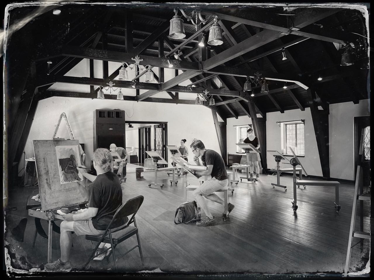 Thursdays offer a single pose that lasts two weeks (roughly six hours total), allowing for more finished, refined, or larger works. Some participants choose to complete just one drawing or painting across the two-day pose, while others will choose to complete multiple works, moving around the room for different views.